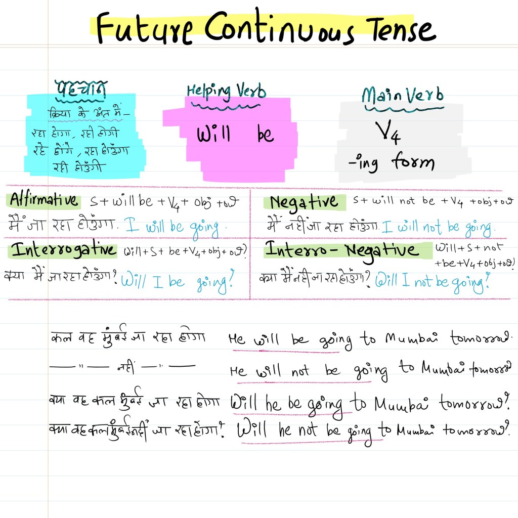 - You will be studying this time next week. (तुम अगले हफ्ते इस समय पढ़ रहे होगे।)