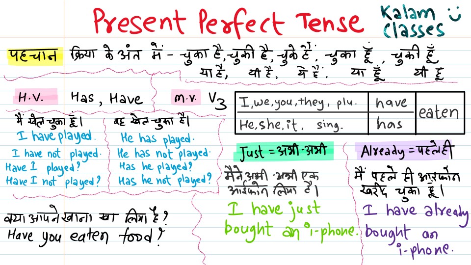 - “Just” का प्रयोग Present Perfect Tense में तब किया जाता है जब कोई कार्य अभी-अभी ( कुछ समय पहले) पूरा हुआ हो।